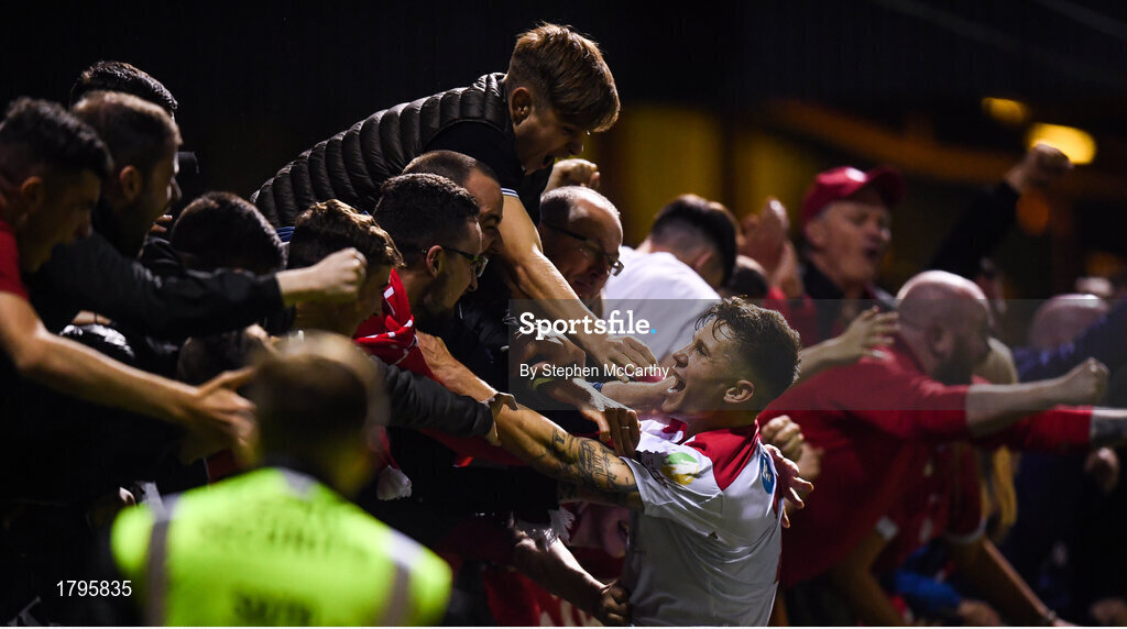 13 September 2019; Luke Byrne of Shelbourne celebrates his side's third goal with supporters during the SSE Airtricity League First Division match between Drogheda United and Shelbourne at United Park in Drogheda, Louth. Photo by Stephen McCarthy/Sportsfile