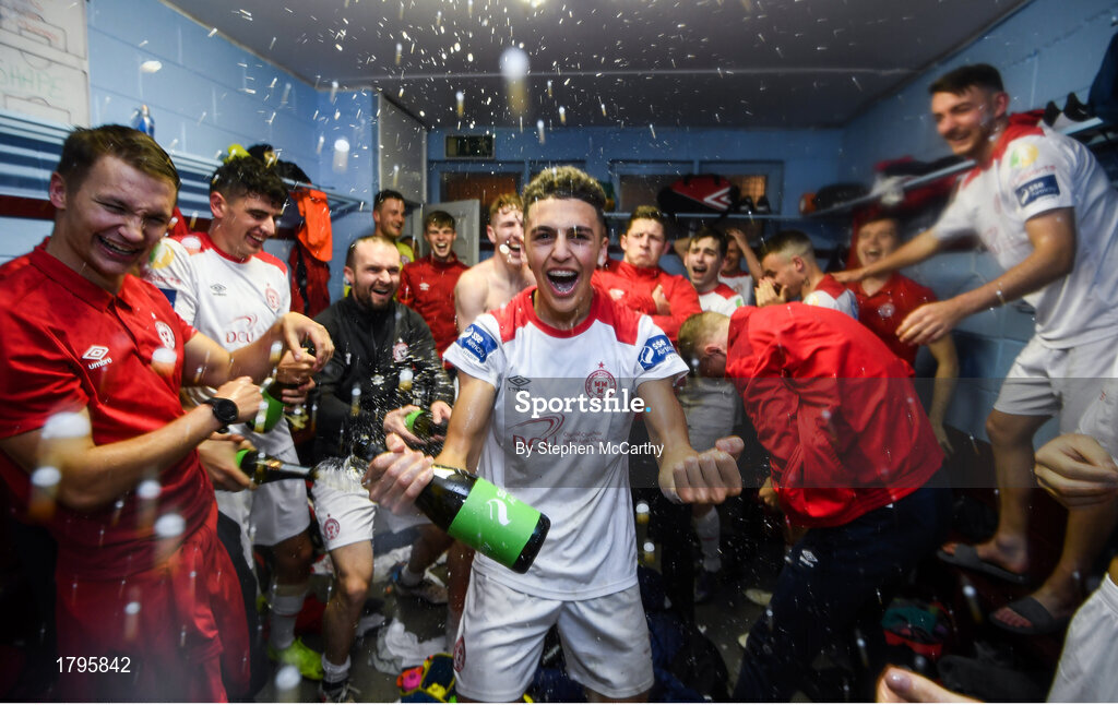 13 September 2019; Jaze Kabia and his Shelbourne team-mates celebrates promotion to the SSE Airtricity League Premier Division following the SSE Airtricity League First Division match between Drogheda United and Shelbourne at United Park in Drogheda, Louth. Photo by Stephen McCarthy/Sportsfile