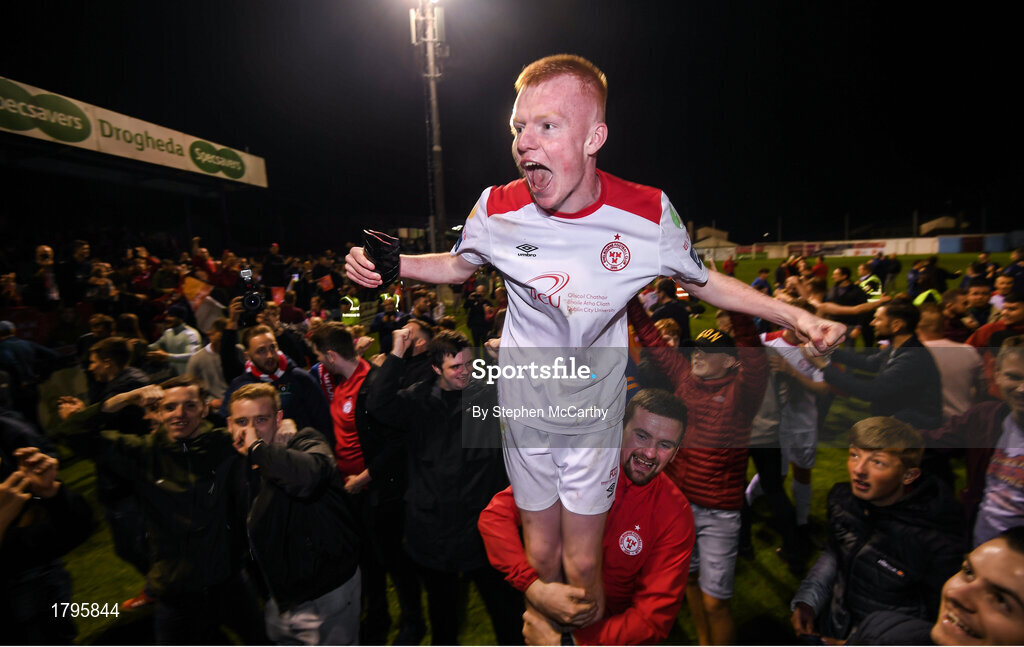 13 September 2019; Shane Farrell of Shelbourne celebrates promotion to the SSE Airtricity League Premier Division following the SSE Airtricity League First Division match between Drogheda United and Shelbourne at United Park in Drogheda, Louth. Photo by Stephen McCarthy/Sportsfile