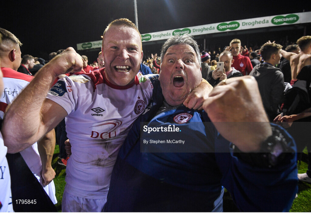 13 September 2019; Lorcan Fitzgerald and John Watson of Shelbourne celebrate promotion to the SSE Airtricity League Premier Division following the SSE Airtricity League First Division match between Drogheda United and Shelbourne at United Park in Drogheda, Louth. Photo by Stephen McCarthy/Sportsfile