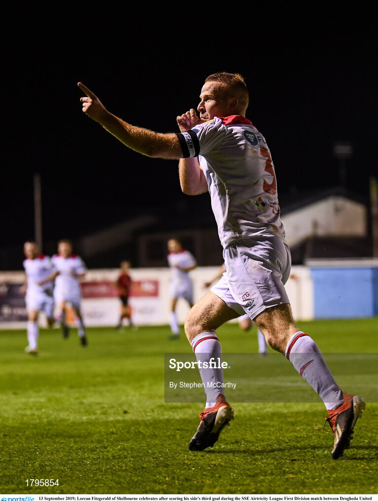 13 September 2019; Lorcan Fitzgerald of Shelbourne celebrates after scoring his side's third goal during the SSE Airtricity League First Division match between Drogheda United and Shelbourne at United Park in Drogheda, Louth. Photo by Stephen McCarthy/Sportsfile