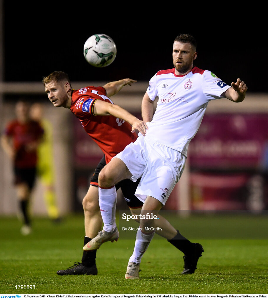 13 September 2019; Ciarán Kilduff of Shelbourne in action against Kevin Farragher of Drogheda United during the SSE Airtricity League First Division match between Drogheda United and Shelbourne at United Park in Drogheda, Louth. Photo by Stephen McCarthy/Sportsfile