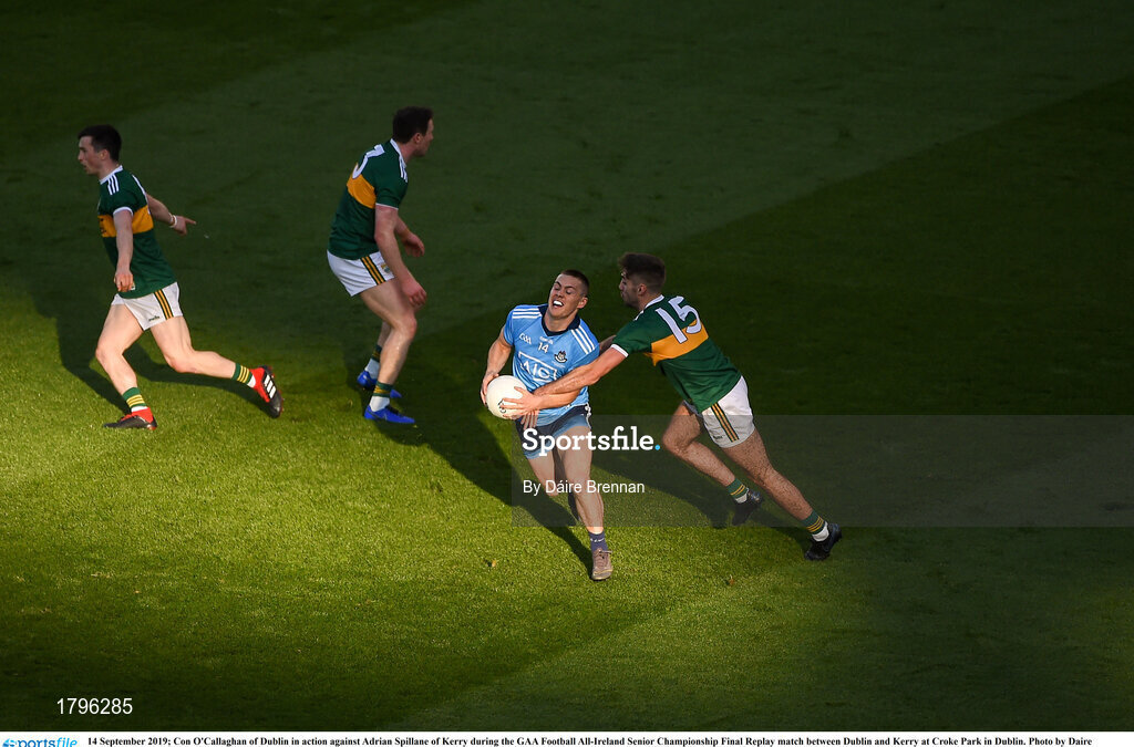 14 September 2019; Con O'Callaghan of Dublin in action against Adrian Spillane of Kerry during the GAA Football All-Ireland Senior Championship Final Replay match between Dublin and Kerry at Croke Park in Dublin. Photo by Daire Brennan/Sportsfile