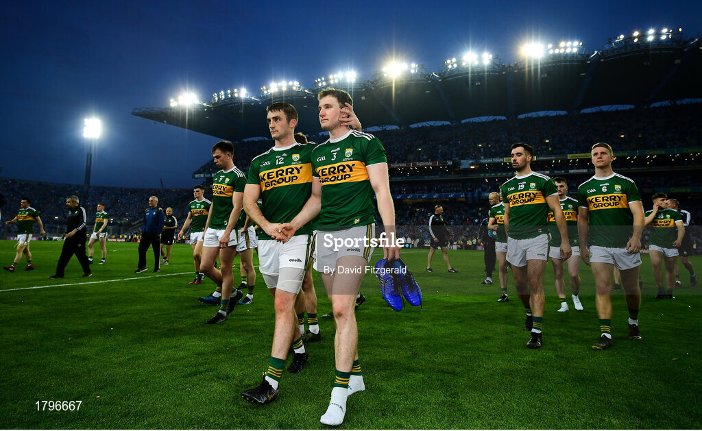 14 September 2019; Stephen O'Brien of Kerry, left, consoles team-mate Tadhg Morley as the team leave the field following the GAA Football All-Ireland Senior Championship Final Replay match between Dublin and Kerry at Croke Park in Dublin. Photo by David Fitzgerald/Sportsfile