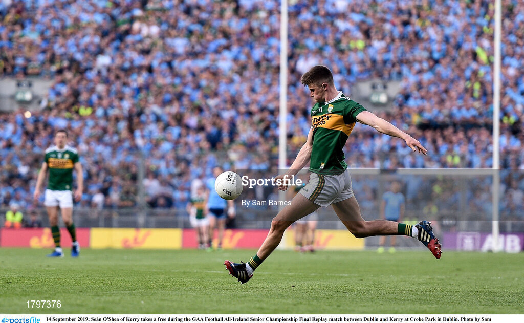 14 September 2019; Seán O'Shea of Kerry takes a free during the GAA Football All-Ireland Senior Championship Final Replay match between Dublin and Kerry at Croke Park in Dublin. Photo by Sam Barnes/Sportsfile