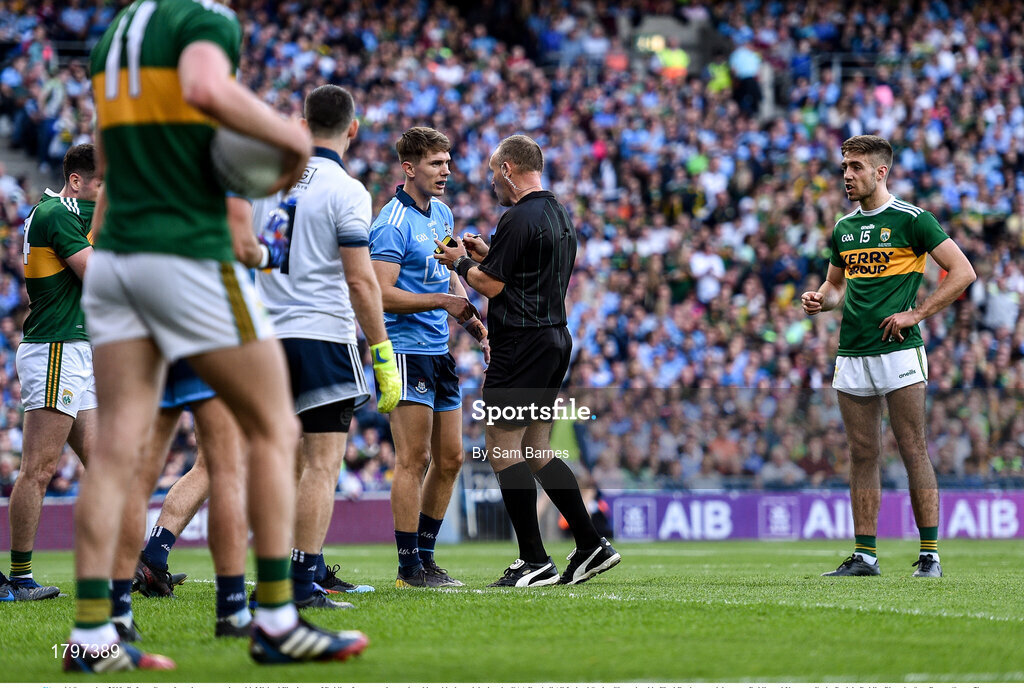14 September 2019; Referee Conor Lane in conversation with Michael Fitzsimons of Dublin after appearing to show him a black card during the GAA Football All-Ireland Senior Championship Final Replay match between Dublin and Kerry at Croke Park in Dublin. Photo by Sam Barnes/Sportsfile