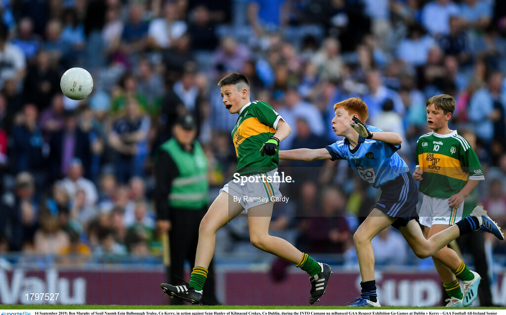 14 September 2019; Ben Murphy of Scoil Naomh Eoin Balloonagh Tralee, Co Kerry, in action against Seán Hanley of Kilmacud Crokes, Co Dublin, during the INTO Cumann na mBunscol GAA Respect Exhibition Go Games at Dublin v Kerry - GAA Football All-Ireland Senior Championship Final Replay at Croke Park in Dublin. Photo by Ramsey Cardy/Sportsfile