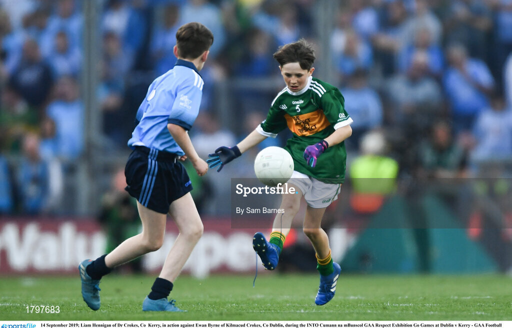 14 September 2019; Liam Hennigan of Dr Crokes, Co Kerry, in action against Ewan Byrne of Kilmacud Crokes, Co Dublin, during the INTO Cumann na mBunscol GAA Respect Exhibition Go Games at Dublin v Kerry - GAA Football All-Ireland Senior Championship Final Replay at Croke Park in Dublin. Photo by Sam Barnes/Sportsfile