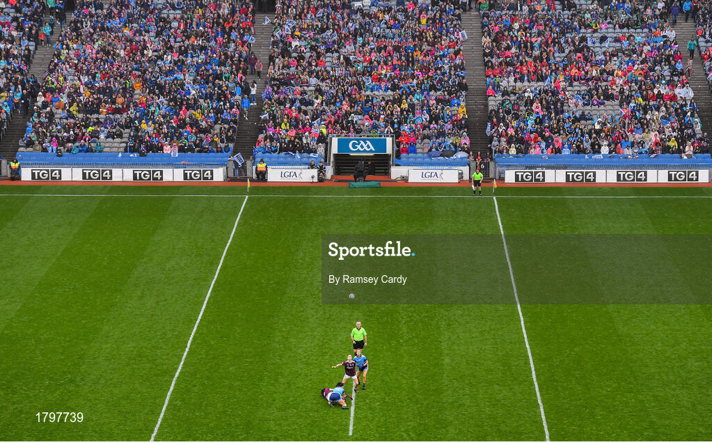15 September 2019; Barbara Hannon of Galway and Lauren Magee of Dublin compete for possession from the throw-in during the TG4 All-Ireland Ladies Football Senior Championship Final match between Dublin and Galway at Croke Park in Dublin. Photo by Ramsey Cardy/Sportsfile