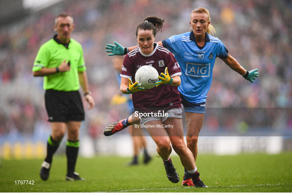 15 September 2019; Nicola Ward of Galway in action against Carla Rowe of Dublin during the TG4 All-Ireland Ladies Football Senior Championship Final match between Dublin and Galway at Croke Park in Dublin. Photo by Stephen McCarthy/Sportsfile