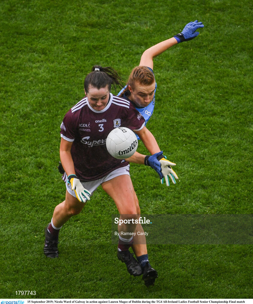 15 September 2019; Nicola Ward of Galway in action against Lauren Magee of Dublin during the TG4 All-Ireland Ladies Football Senior Championship Final match between Dublin and Galway at Croke Park in Dublin. Photo by Ramsey Cardy/Sportsfile
