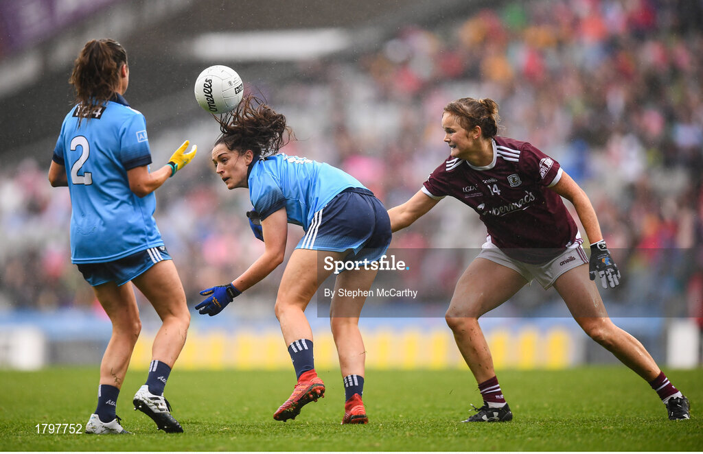 15 September 2019; Sinéad Goldrick of Dublin in action against Sarah Conneally of Galway during the TG4 All-Ireland Ladies Football Senior Championship Final match between Dublin and Galway at Croke Park in Dublin. Photo by Stephen McCarthy/Sportsfile
