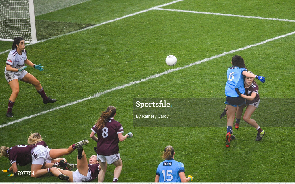 15 September 2019; Sinéad Goldrick of Dublin shoots to score her side's first goal despite the attention of Sarah Lynch of Galway during the TG4 All-Ireland Ladies Football Senior Championship Final match between Dublin and Galway at Croke Park in Dublin. Photo by Ramsey Cardy/Sportsfile