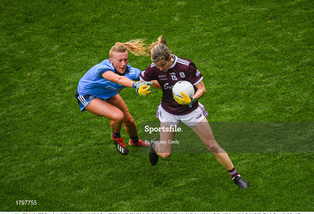 15 September 2019; Tracey Leonard of Galway in action against Carla Rowe of Dublin during the TG4 All-Ireland Ladies Football Senior Championship Final match between Dublin and Galway at Croke Park in Dublin. Photo by Ramsey Cardy/Sportsfile