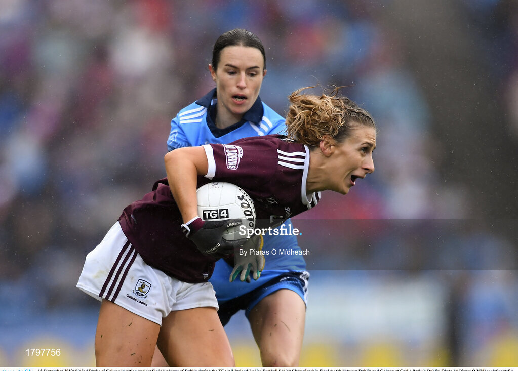 15 September 2019; Sinéad Burke of Galway in action against Sinéad Aherne of Dublin during the TG4 All-Ireland Ladies Football Senior Championship Final match between Dublin and Galway at Croke Park in Dublin. Photo by Piaras Ó Mídheach/Sportsfile