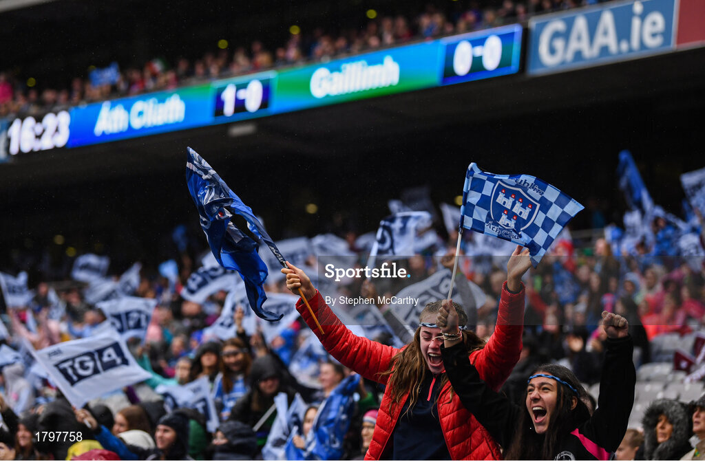 15 September 2019; Dublin supporters celebrate their side's first goal during the TG4 All-Ireland Ladies Football Senior Championship Final match between Dublin and Galway at Croke Park in Dublin. Photo by Stephen McCarthy/Sportsfile