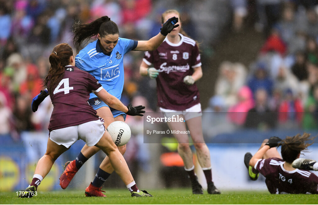 15 September 2019; Sinéad Goldrick of Dublin shoots to score her side's first goal as Sarah Lynch of Galway, 4, closes in during the TG4 All-Ireland Ladies Football Senior Championship Final match between Dublin and Galway at Croke Park in Dublin. Photo by Piaras Ó Mídheach/Sportsfile