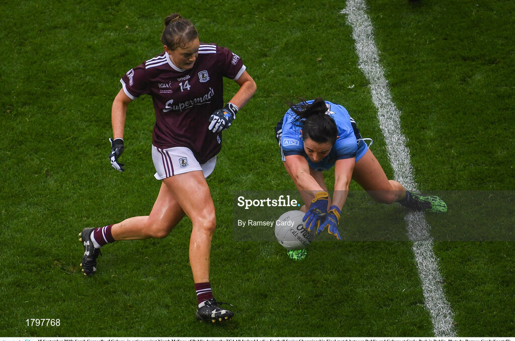 15 September 2019; Sarah Conneally of Galway in action against Niamh McEvoy of Dublin during the TG4 All-Ireland Ladies Football Senior Championship Final match between Dublin and Galway at Croke Park in Dublin. Photo by Ramsey Cardy/Sportsfile