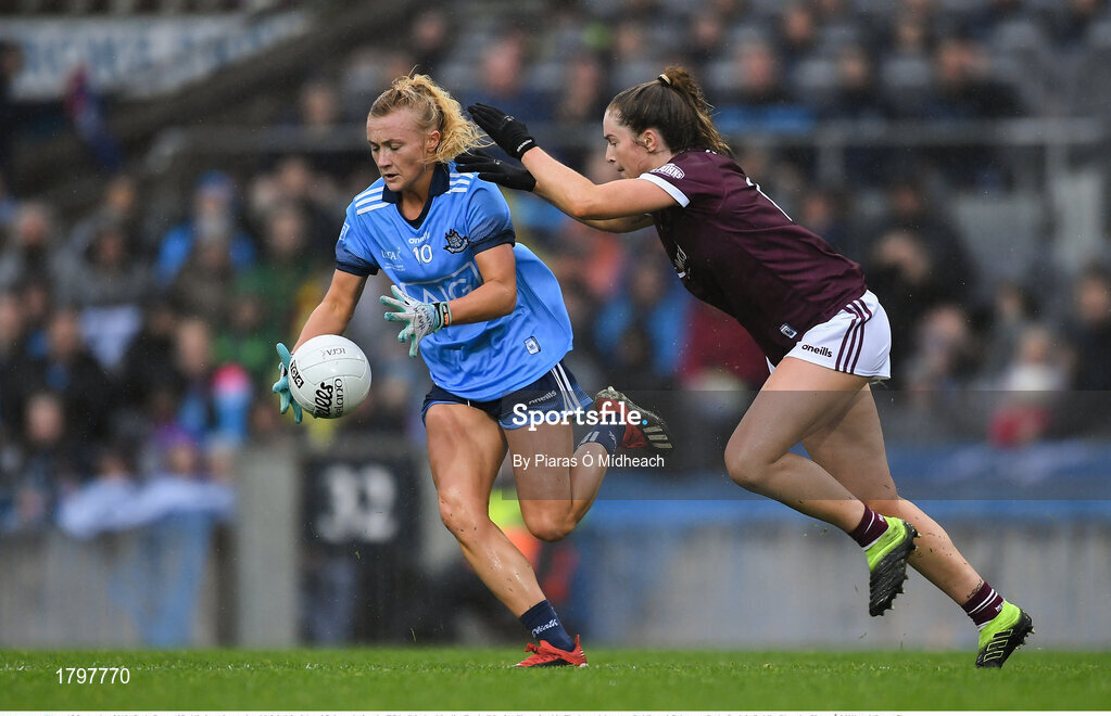 15 September 2019; Carla Rowe of Dublin in action against Mairéad Seoighe of Galway during the TG4 All-Ireland Ladies Football Senior Championship Final match between Dublin and Galway at Croke Park in Dublin. Photo by Piaras Ó Mídheach/Sportsfile