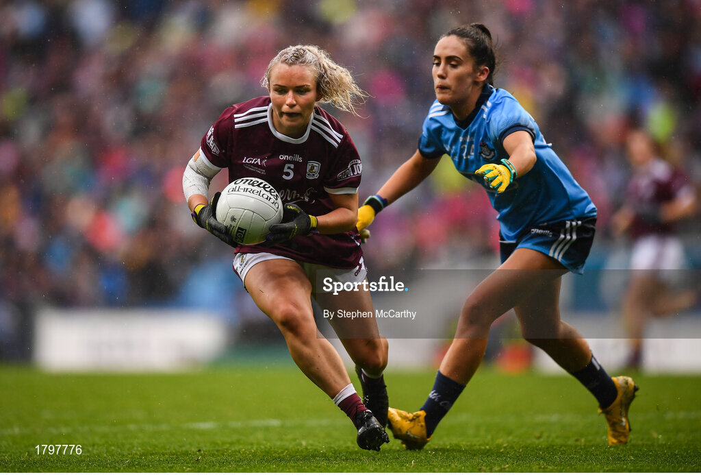15 September 2019; Orla Murphy of Galway in action against Hannah O'Neill of Dublin during the TG4 All-Ireland Ladies Football Senior Championship Final match between Dublin and Galway at Croke Park in Dublin. Photo by Stephen McCarthy/Sportsfile