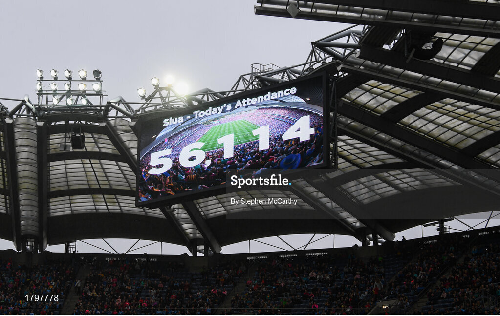 15 September 2019; A view of the big screen as the attendance of 56,114, a new attendance record, is shown during the TG4 All-Ireland Ladies Football Senior Championship Final match between Dublin and Galway at Croke Park in Dublin. Photo by Stephen McCarthy/Sportsfile