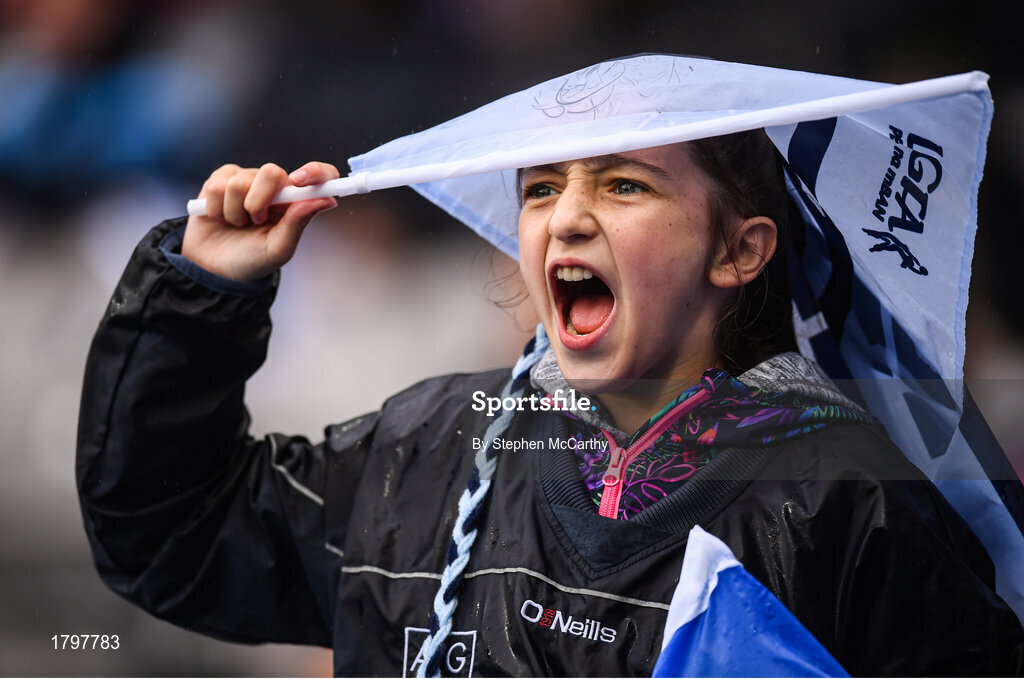15 September 2019; A Dublin supporter urges on her side during the TG4 All-Ireland Ladies Football Senior Championship Final match between Dublin and Galway at Croke Park in Dublin. Photo by Stephen McCarthy/Sportsfile