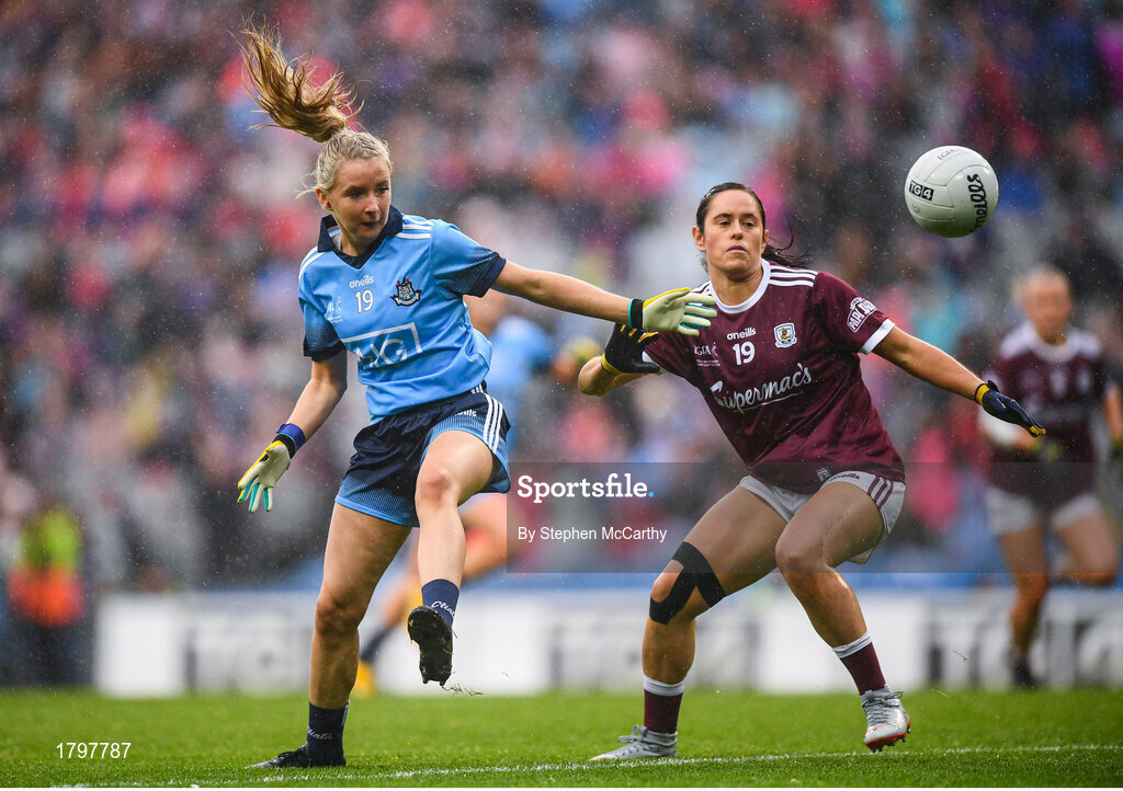 15 September 2019; Caoimhe O'Connor of Dublin in action against Fabienne Cooney of Galway during the TG4 All-Ireland Ladies Football Senior Championship Final match between Dublin and Galway at Croke Park in Dublin. Photo by Stephen McCarthy/Sportsfile