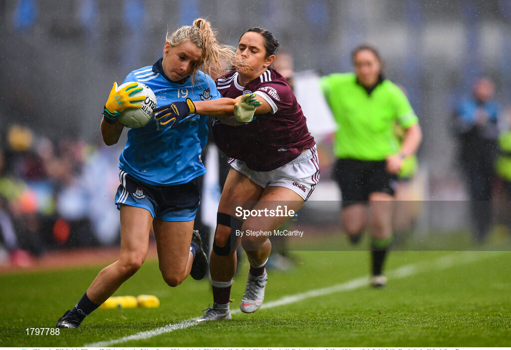 15 September 2019; Caoimhe O'Connor of Dublin in action against Fabienne Cooney of Galway during the TG4 All-Ireland Ladies Football Senior Championship Final match between Dublin and Galway at Croke Park in Dublin. Photo by Stephen McCarthy/Sportsfile