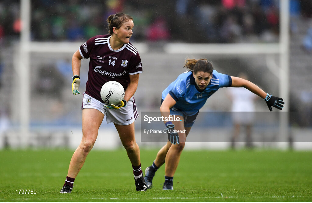 15 September 2019; Sarah Conneally of Galway in action against Noëlle Healy of Dublin during the TG4 All-Ireland Ladies Football Senior Championship Final match between Dublin and Galway at Croke Park in Dublin. Photo by Piaras Ó Mídheach/Sportsfile