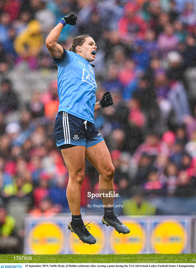 15 September 2019; Noëlle Healy of Dublin celebrates after scoring a point during the TG4 All-Ireland Ladies Football Senior Championship Final match between Dublin and Galway at Croke Park in Dublin. Photo by Stephen McCarthy/Sportsfile