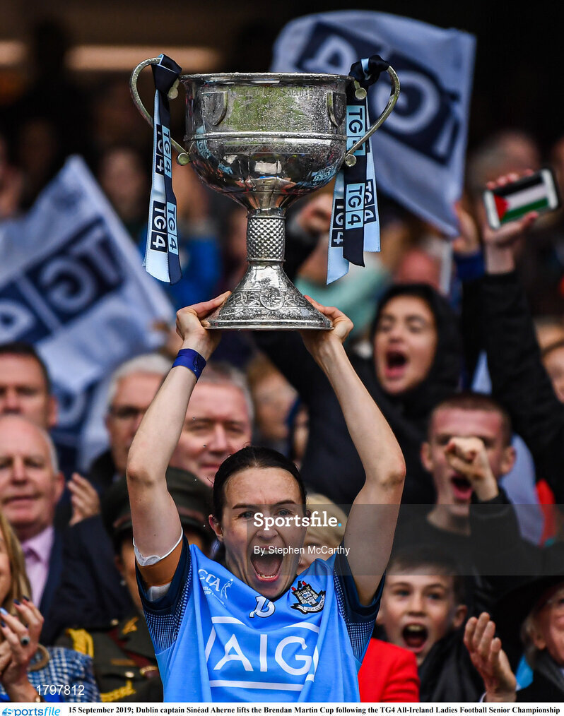 15 September 2019; Dublin captain Sinéad Aherne lifts the Brendan Martin Cup following the TG4 All-Ireland Ladies Football Senior Championship Final match between Dublin and Galway at Croke Park in Dublin. Photo by Stephen McCarthy/Sportsfile