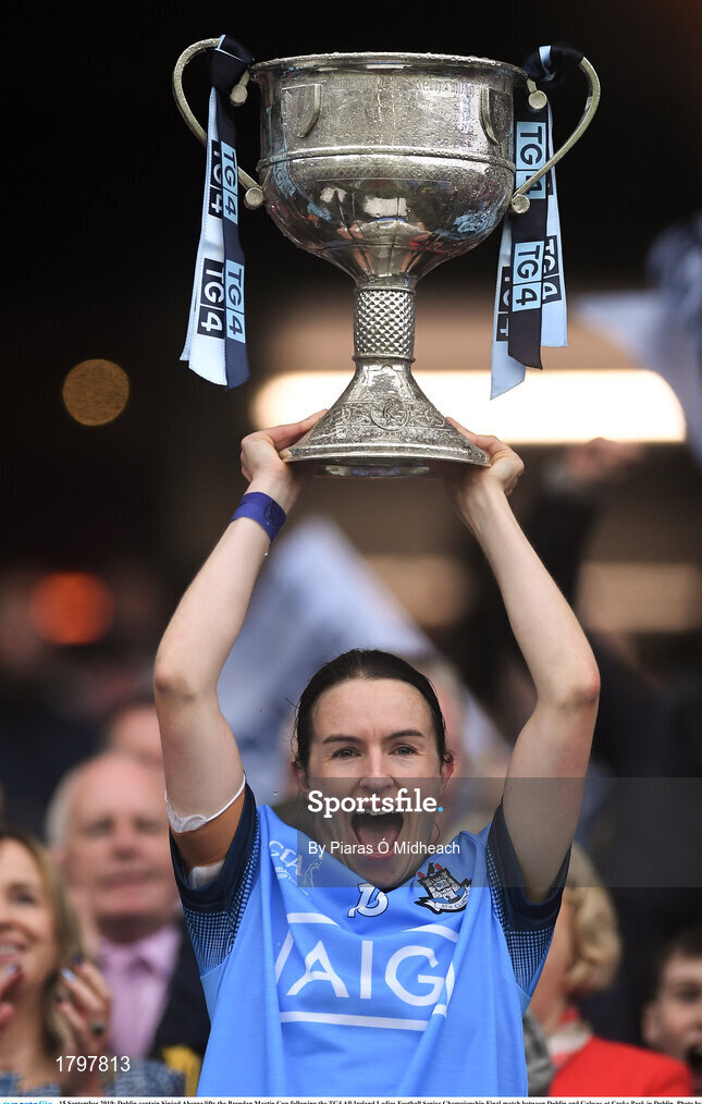 15 September 2019; Dublin captain Sinéad Aherne lifts the Brendan Martin Cup following the TG4 All-Ireland Ladies Football Senior Championship Final match between Dublin and Galway at Croke Park in Dublin. Photo by Piaras Ó Mídheach/Sportsfile
