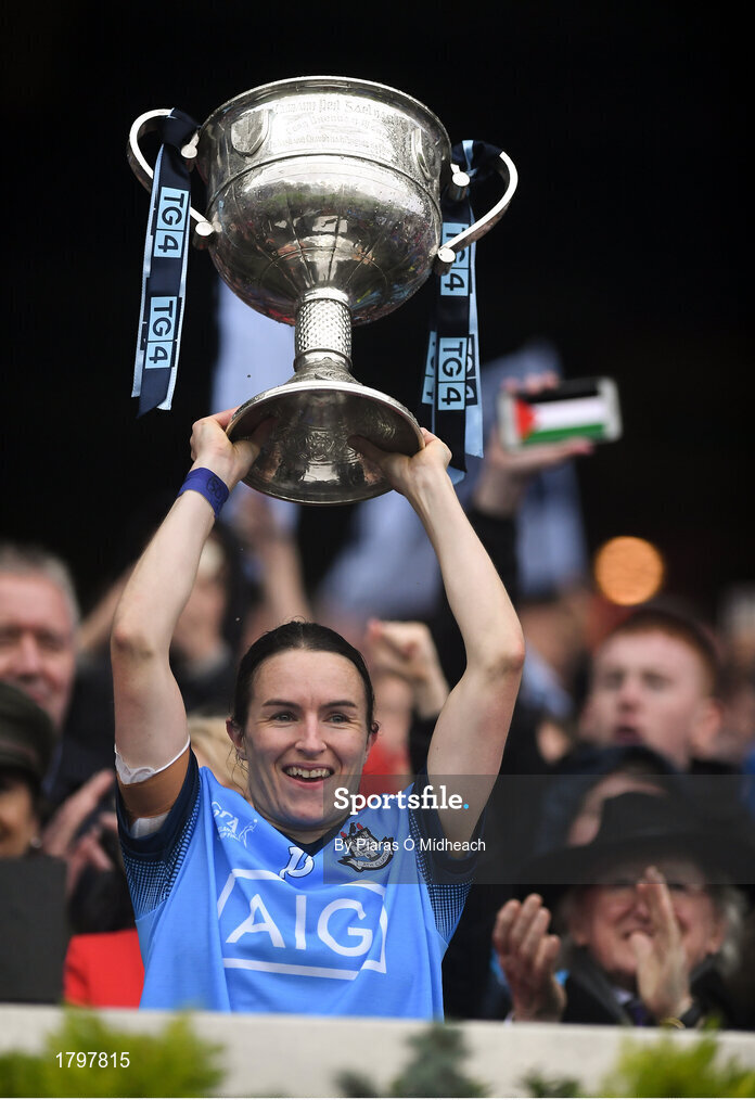 15 September 2019; Dublin captain Sinéad Aherne lifts the Brendan Martin Cup following the TG4 All-Ireland Ladies Football Senior Championship Final match between Dublin and Galway at Croke Park in Dublin. Photo by Piaras Ó Mídheach/Sportsfile