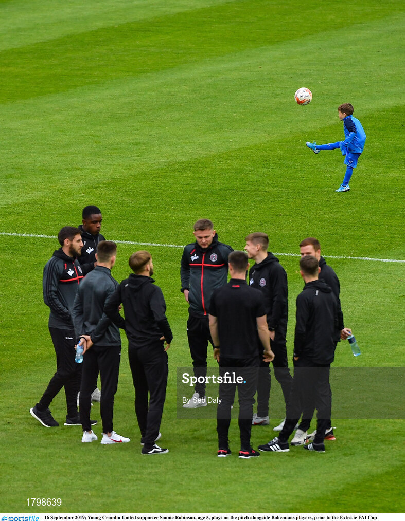 16 September 2019; Young Crumlin United supporter Sonnie Robinson, age 5, plays on the pitch alongside Bohemians players, prior to the Extra.ie FAI Cup Quarter-Final match between Crumlin United and Bohemians at Richmond Park in Dublin. Photo by Seb Daly/Sportsfile