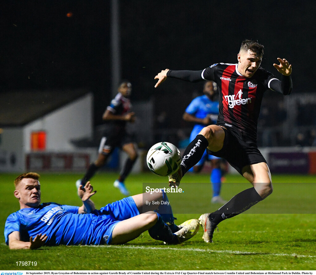16 September 2019; Ryan Graydon of Bohemians in action against Gareth Brady of Crumlin United during the Extra.ie FAI Cup Quarter-Final match between Crumlin United and Bohemians at Richmond Park in Dublin. Photo by Seb Daly/Sportsfile