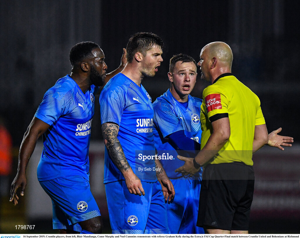 16 September 2019; Crumlin players, from left, Blair Mandiangu, Conor Murphy and Noel Cummins remonstrate with referee Graham Kelly during the Extra.ie FAI Cup Quarter-Final match between Crumlin United and Bohemians at Richmond Park in Dublin. Photo by Seb Daly/Sportsfile