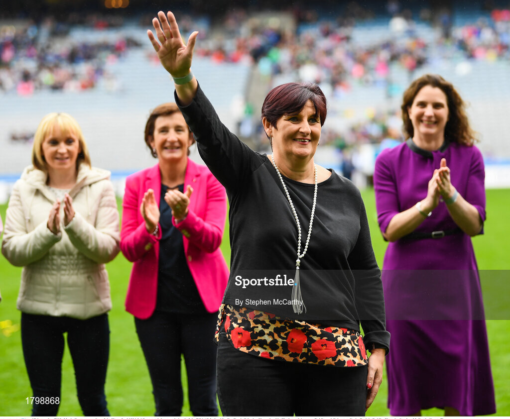 15 September 2019; Marie Crotty a member of the Waterford 1994 Jubilee team is honoured ahead of the TG4 All-Ireland Ladies Football Senior Championship Final match between Dublin and Galway at Croke Park in Dublin. Photo by Stephen McCarthy/Sportsfile