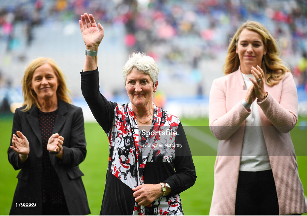 15 September 2019; Patricia Butler a member of the Waterford 1994 Jubilee team is honoured ahead of the TG4 All-Ireland Ladies Football Senior Championship Final match between Dublin and Galway at Croke Park in Dublin. Photo by Stephen McCarthy/Sportsfile