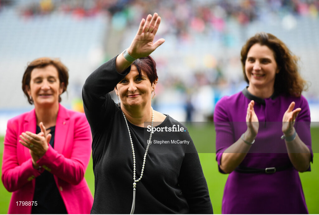 15 September 2019; Marie Crotty a member of the Waterford 1994 Jubilee team is honoured ahead of the TG4 All-Ireland Ladies Football Senior Championship Final match between Dublin and Galway at Croke Park in Dublin. Photo by Stephen McCarthy/Sportsfile