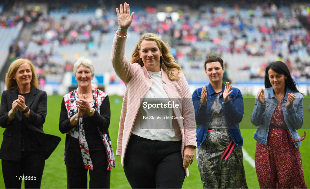 15 September 2019; Caroline Ahearn, on behalf of her sister Ruth, a member of the Waterford 1994 Jubilee team is honoured ahead of the TG4 All-Ireland Ladies Football Senior Championship Final match between Dublin and Galway at Croke Park in Dublin. Photo by Stephen McCarthy/Sportsfile