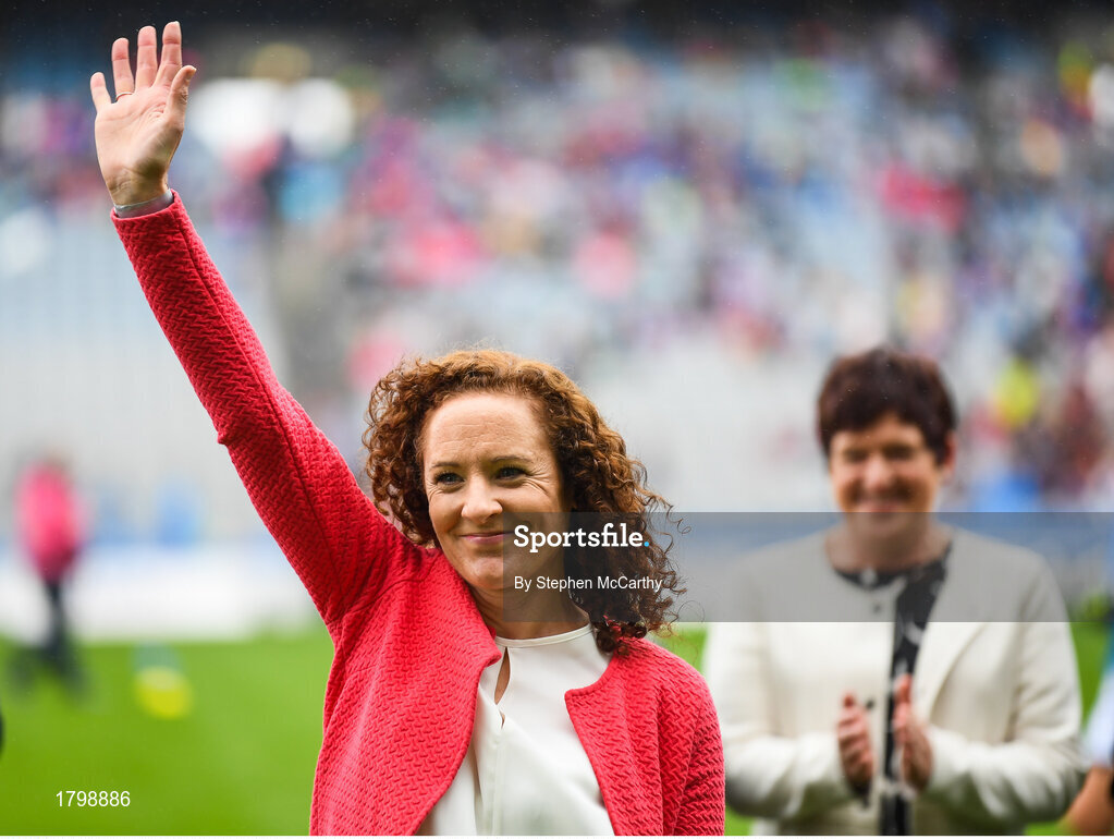 15 September 2019; Lorena Mooney a member of the Waterford 1994 Jubilee team is honoured ahead of the TG4 All-Ireland Ladies Football Senior Championship Final match between Dublin and Galway at Croke Park in Dublin. Photo by Stephen McCarthy/Sportsfile