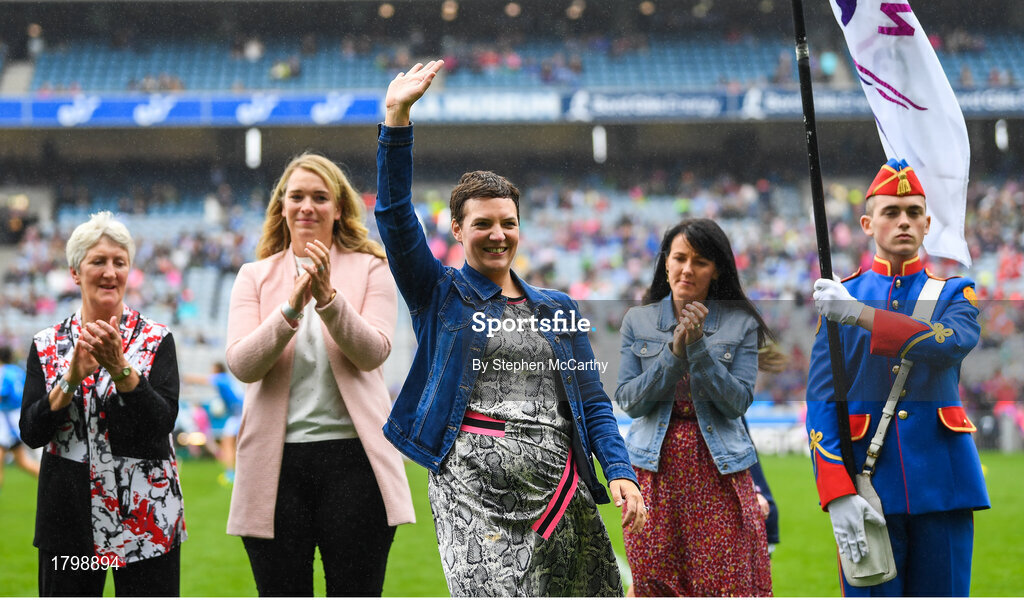 15 September 2019; Catherine Walsh a member of the Waterford 1994 Jubilee team is honoured ahead of the TG4 All-Ireland Ladies Football Senior Championship Final match between Dublin and Galway at Croke Park in Dublin. Photo by Stephen McCarthy/Sportsfile