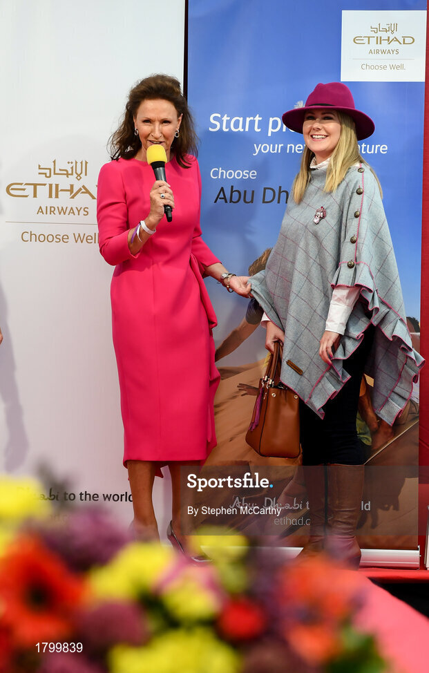 18 September 2019; Celia Holman Lee with Andrea Murphy, from Kilkenny, during the Etihad Airways’ ‘Best Dressed Country Style’ competition at the National Ploughing Championship in Ballintrane, Fenagh, Co. Carlow. This year’s prize includes two return economy flights from Dublin to Abu Dhabi, a two-night stay in the luxury Yas Hotel built over the F1 Grand Prix race track, a two-night stay in the prominent 5-Star Fairmont Bab Al Bahr and two complimentary 3-park passes for Yas Island. Photo by Stephen McCarthy/Sportsfile