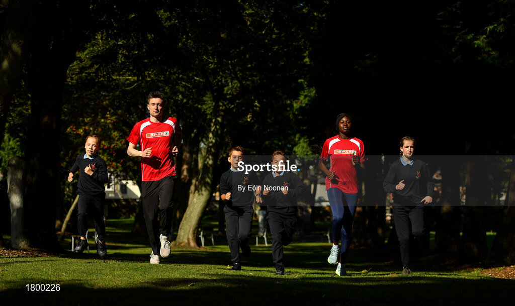 19 September 2019; On hand to help promote the Daily Mile and SPAR Better Choices were Irish international athletes and SPAR ambassadors Rhasidat Adeleke and Mark English with Scoil Mhuire Gan Smál pupils, from left, Mia Davey, Tomas Quilmore, Stefan Mirt and Lorna Nolan. The Daily Mile programme sees primary school children around the country run or jog at their own pace for 15 minutes every day to improve their mental and physical health. Nearly 1,000 schools are taking part in this initiative across the country. To sign up your school log onto https://thedailymile.ie/. For advice on healthy eating and wellbeing for school children log onto https://www.spar.ie/betterchoices/. Photo by Eóin Noonan/Sportsfile