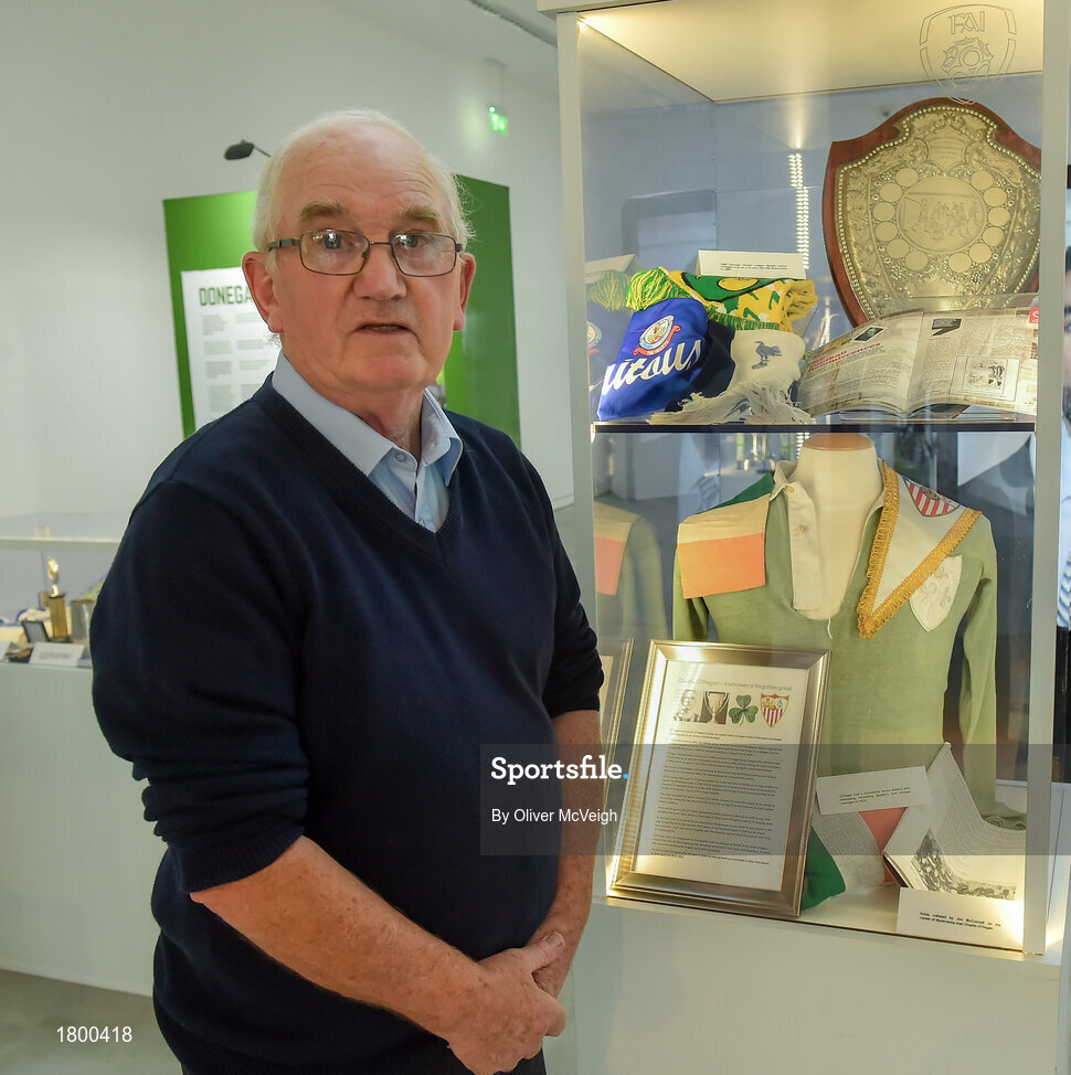 19 September 2019; Jim McConnell from Buncrana stands alongside an exhibit of memorabilia from the local area on show at the National Football Exhibition launch in the Regional Cultural Centre, Letterkenny, Donegal. Photo by Oliver McVeigh/Sportsfile