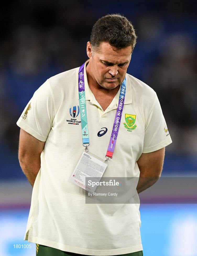21 September 2019; South Africa head coach Rassie Erasmus ahead of the 2019 Rugby World Cup Pool B match between New Zealand and South Africa at the International Stadium in Yokohama, Japan. Photo by Ramsey Cardy/Sportsfile