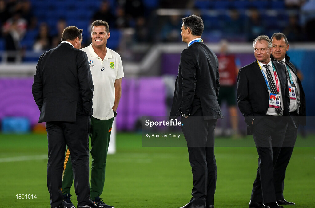 21 September 2019; South Africa head coach Rassie Erasmus, second left, in conversation with New Zealand head coach Steve Hansen, left, ahead of the 2019 Rugby World Cup Pool B match between New Zealand and South Africa at the International Stadium in Yokohama, Japan. Photo by Ramsey Cardy/Sportsfile