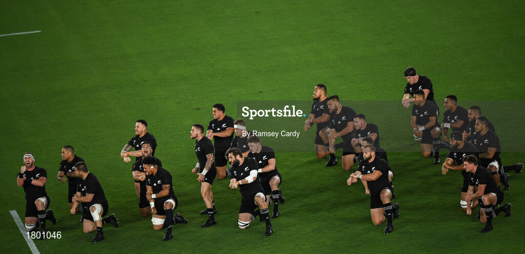 21 September 2019; The New Zealand team during the haka prior to the 2019 Rugby World Cup Pool B match between New Zealand and South Africa at the International Stadium in Yokohama, Japan. Photo by Ramsey Cardy/Sportsfile