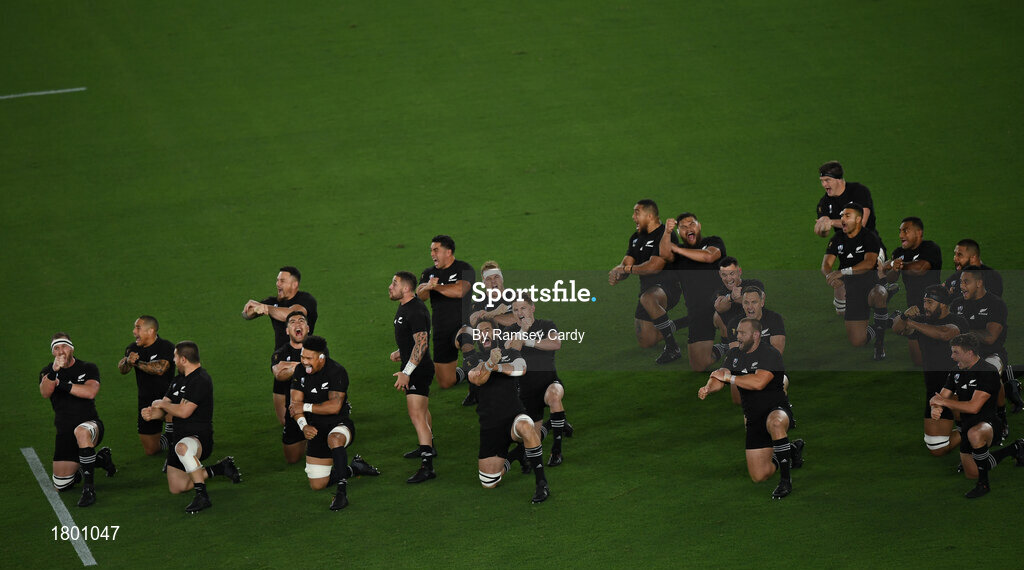 21 September 2019; The New Zealand team during the haka prior to the 2019 Rugby World Cup Pool B match between New Zealand and South Africa at the International Stadium in Yokohama, Japan. Photo by Ramsey Cardy/Sportsfile