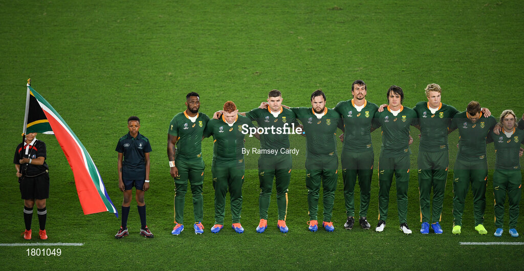21 September 2019; The South African team during the national anthem prior to the 2019 Rugby World Cup Pool B match between New Zealand and South Africa at the International Stadium in Yokohama, Japan. Photo by Ramsey Cardy/Sportsfile